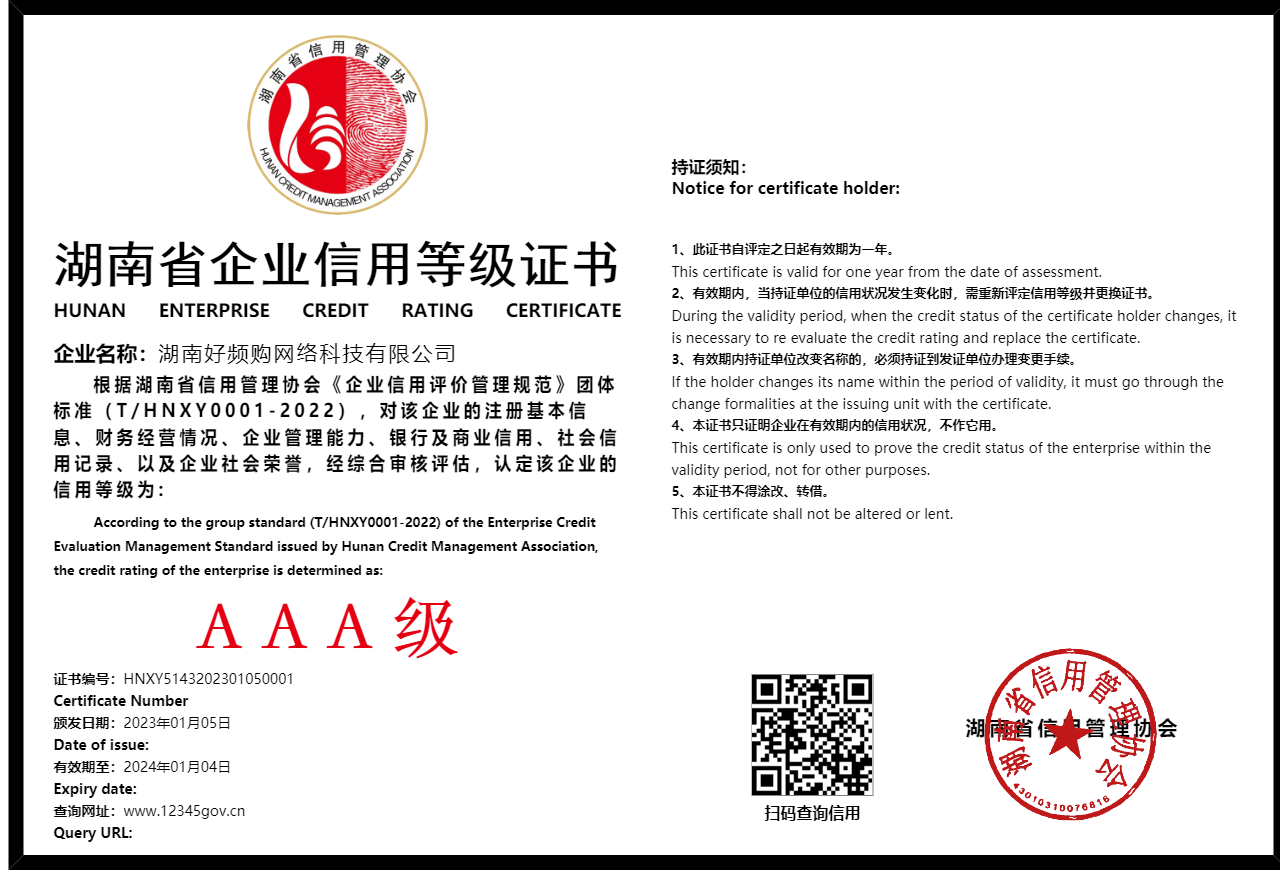 湖南好频购网络科技有限公司已经在湖南省信用管理协会官网上提交了企业信用等级评价材料,根据协会《企业信用评价管理规范》(T/HNXY0001-2022)团体标准,评价机构对该公司的企业注册信息、财务经营情况、企业管理能力、企业银行信用、企业社会信用、企业社会荣誉等信息进行核对,并针对该公司历史上是否存在违约失信行为进行例行调查,综合该企业所有情况,进行定量和定性分析,并依据团体标准评分规则,以公平、公正、客观、科学、独立的原则对该企业进行客观信用评价,评定机构认定该企业为信用等级 AAA 级予以公示,在此期间,受评企业将接受全社会监督,如出现违约失信行为未被披露的,请实名制向评定机构举报。